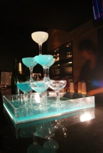 グラスから溢れたシャンパンが2段目、3段目、そして、全体へと伝わり、