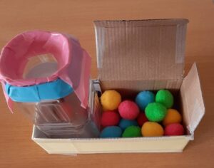 この毛糸玉を入れるんだよ。…あっ、遊んじゃダメだよ!これを1個持って。…そしてこっちの穴に入れるの。この穴だってば