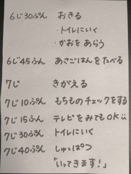 それぞれの行動をする時刻は、時計の絵を使うなどして視覚化してあげるといいですね。